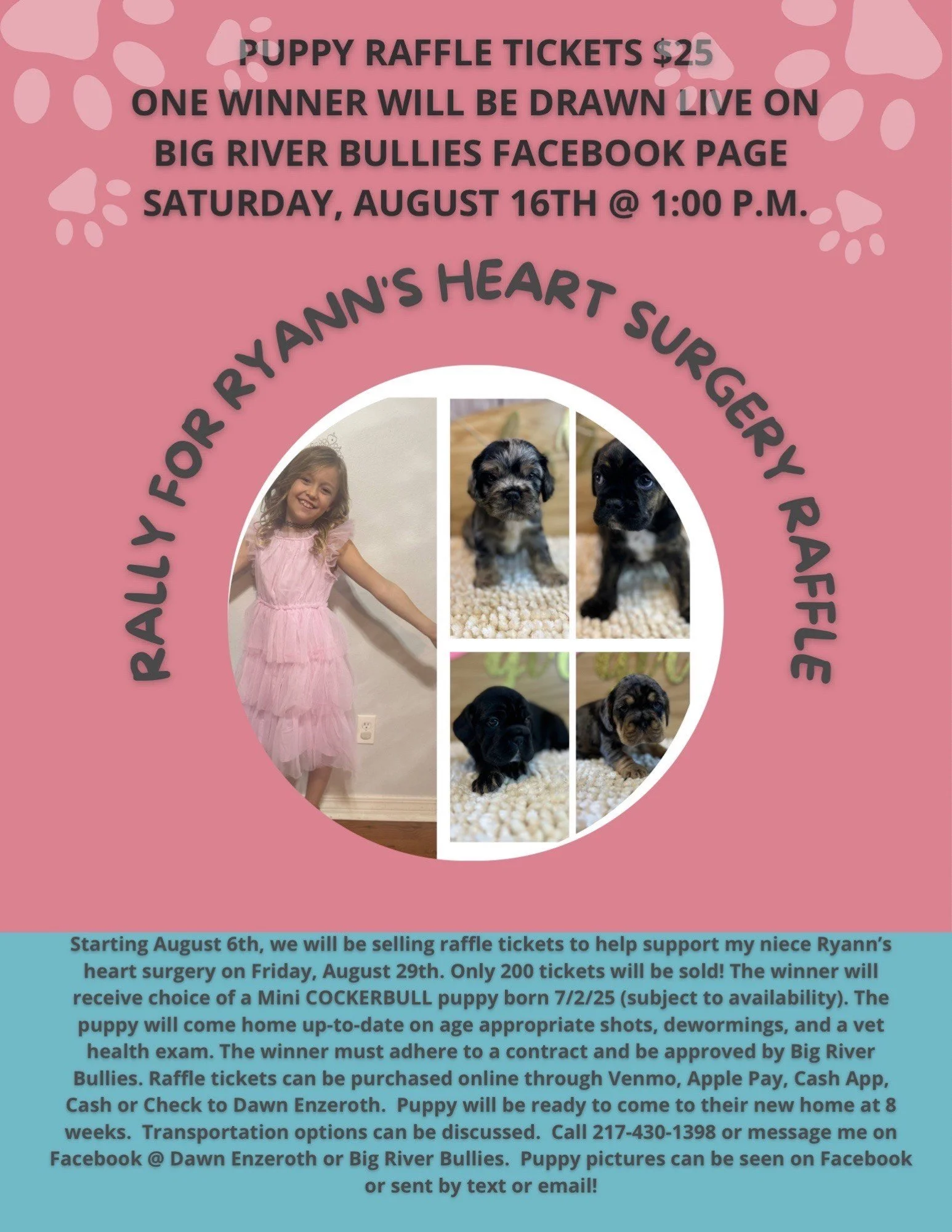 Starting August 6th, we will be selling raffle tickets to help support my niece Ryann's heart surgery on Friday, August 29th. Only 200 tickets will be sold! The winner will receive choice of a Mini COCKERBULL puppy born 7/2/25 (subject to availability). The puppy will come home up-to-date on age appropriate shots, dewormings, and a vet health exam. The winner must adhere to a contract and be approved by Big River Bullies. Raffle tickets can be purchased online through Venmo, Apple Pay, Cash App, Cash or Check to Dawn Enzeroth. Puppy will be ready to come to their new home at 8 weeks. Transportation options can be discussed. Call 217-430-1398 or message me on Facebook @ Dawn Enzeroth or Big River Bullies. Puppy pictures can be seen on Facebook or sent by text or email!